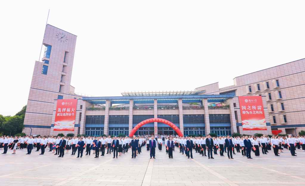 弘扬爱国精神,砥砺强国之志,凝聚奋进力量,10月1日清晨,福州大学各校区同步举行庆祝中华人民共和国成立76周年升国旗仪式。在旗山校区福万广场,校领导陈国龙、吴明红、王向阳、黄阿火、杨黄浩、王心晨、郑煦林、张亚雷、江莉龙、邱挺、卢孝强,学校机关各部门、各单位主要负责人,各学院主要负责人,全体学生政工干部及师生代表参加升旗仪式。